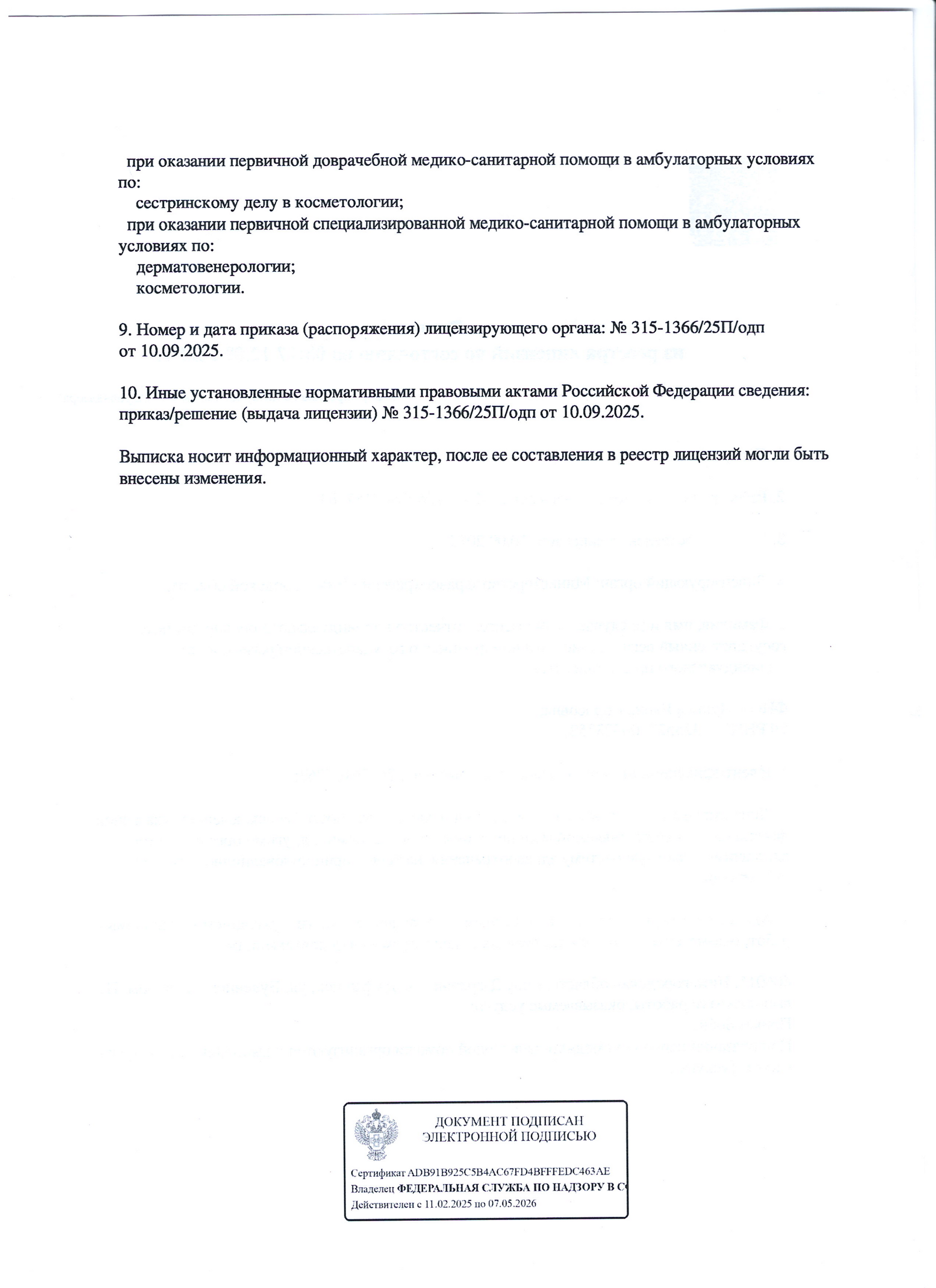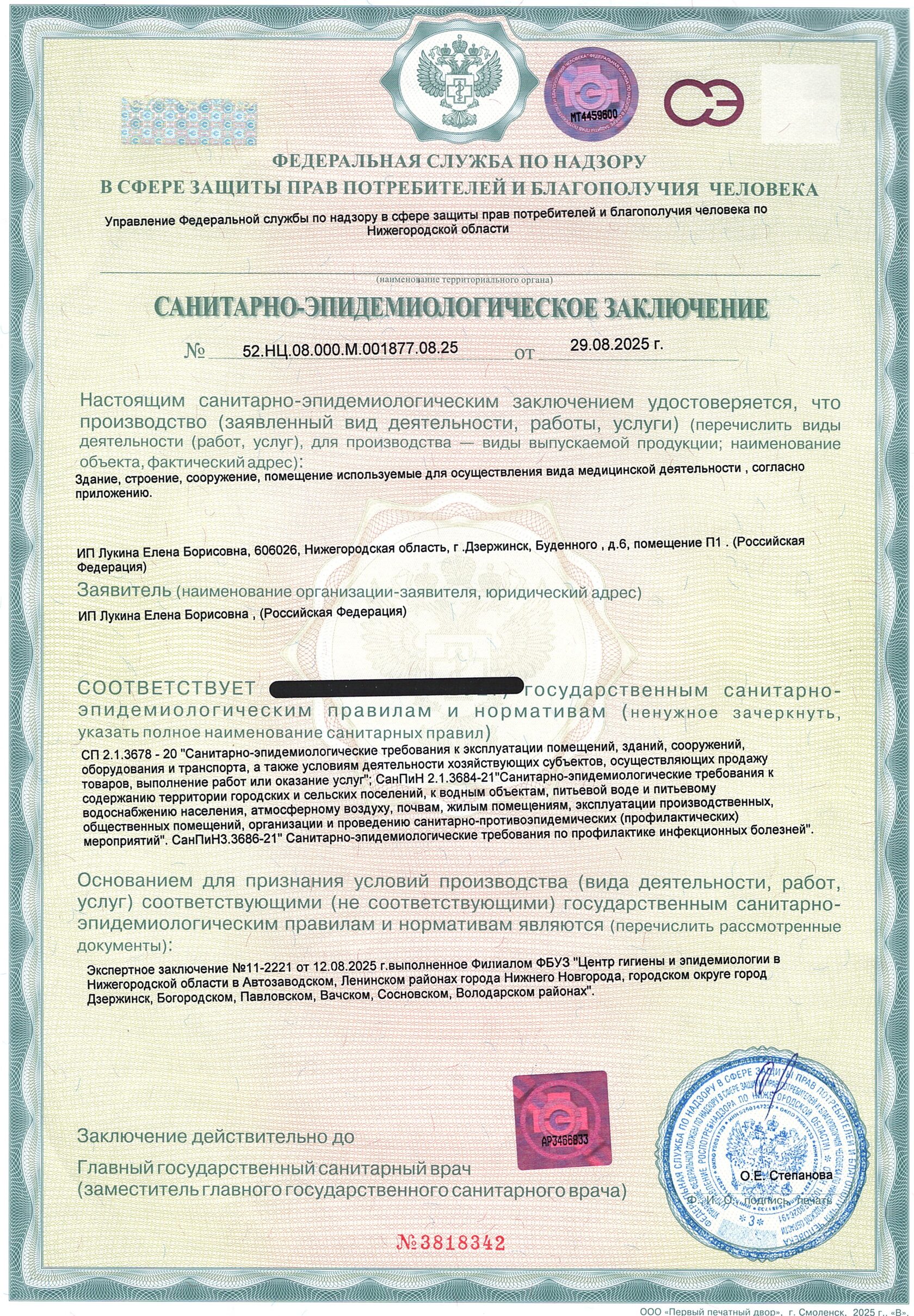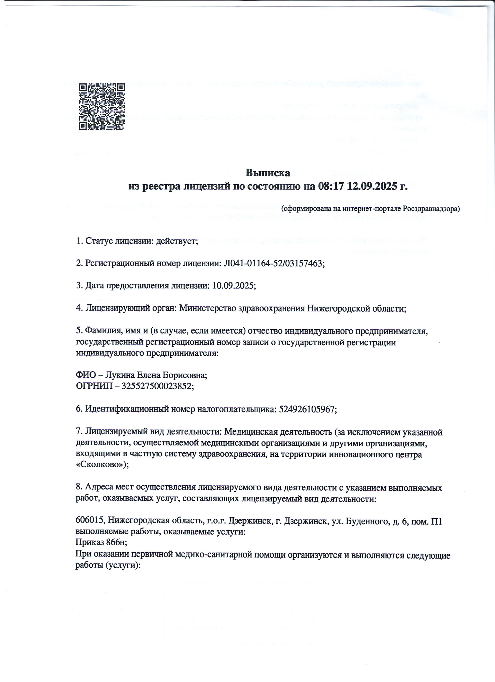 Лицензия N Л041-01164-52/03157463 от 10 сентября 2025 г., выданная Министерством здравоохранения Нижегородской области.